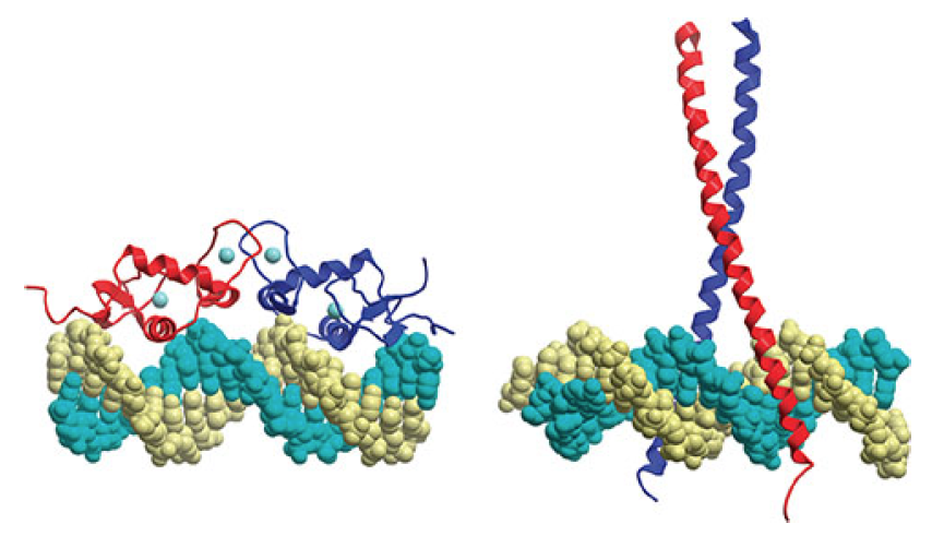 The figure below shows two different transcription factors in ribbon style bound to double helical DNA shown in space filling style. Which one of the following statements describes the structure-function relationship between these two proteins?