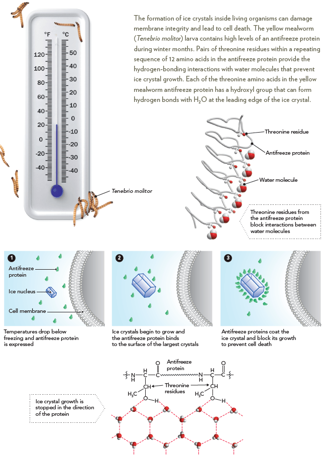 Water is critical for life and is considered the universal solvent because of its unique properties. When temperatures drop below the freezing point of water, however, ice crystals form and can be lethal to cells. Cold-blooded organisms that live in cold climates have evolved mechanisms to cope with freezing temperatures, one of which is the synthesis of antifreeze proteins that block ice crystal growth. The larval antifreeze protein contains multiple stretches of 12 amino acids that repeat the sequence threonine–cysteine–threonine. The placement of the threonines in the repeating amino acid sequence positions their hydroxyl groups at precisely the spacing needed to maximize hydrogen bond formation with the water molecules at the leading edge of the ice crystal, thereby blocking further growth of the crystal lattice.