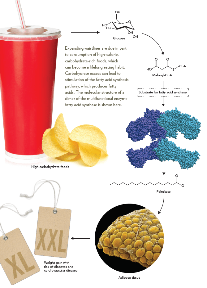 Carbon substrates for fatty acid synthesis are primarily derived from dietary carbohydrates in the form of glucose, which is used to generate acetyl-CoA and glycerol for the production of triacylglycerols. High-carbohydrate snacks such as cookies, soda, and potato chips are often consumed in large quantities, leading to excess levels of acetyl-CoA. Conversion of acetyl-CoA to malonyl- CoA by the enzyme fatty acid synthase leads to the production of fatty acids such as palmitate. Synthesis of triacylglycerols from palmitate, a product of the fatty acid synthase reaction, results in increased stored fat in adipose tissue. Consumption of large amounts of carbohydrate-rich foods and beverages, even if they are low in fat, can lead to an increased risk of obesity and diabetes.