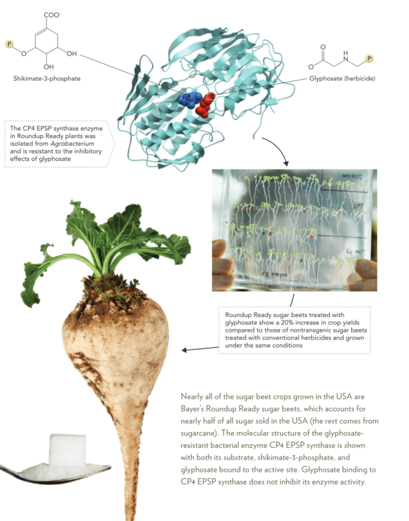 Glyphosate is the active compound in the herbicide Roundup. It inhibits the enzyme 5-enolpyruvylshikimate-3-phosphate (EPSP) synthase, which is required to synthesize the aromatic amino acids tryptophan, tyrosine, and phenylalanine. Plants sprayed with glyphosate stop growing and die because they cannot make these aromatic amino acids needed for protein synthesis. Transgenic crop plants that contain a gene encoding the glyphosate-resistant bacterial enzyme CP4 EPSP synthase are called Roundup Ready plants and do not die when treated with glyphosate. Although the use of glyphosate as an herbicide to increase crop yields in Roundup Ready crops is well documented, there have been concerns about its detrimental effect on native plants and about possible human health hazards resulting from chronic exposure to high levels of glyphosate. Moreover, because glyphosate-resistant weeds are becoming more common, there is a need to develop alternate approaches to sustainable agriculture in order to meet predicted global food shortages.