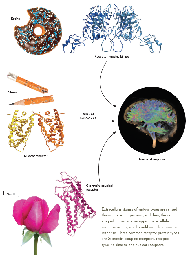Cell signaling systems link the extracellular environment to changes in cellular behavior. Several classes of receptor proteins sense different types of extracellular inputs and, in response, stimulate a variety of intracellular biochemical processes. The common feature of these signaling systems is that they amplify signals through enzyme-mediated reactions. This signaling occurs through ligand binding to receptor proteins, which causes conformational changes in the receptor proteins that affect the biochemical activities of intracellular proteins. The G protein–coupled receptor (GPCR) illustrates the specific GPCR signaling in human sensory pathways required for sight, smell, and taste. The insulin receptor, which is a type of receptor tyrosine kinase, illustrates the downstream signaling pathways initiated by insulin binding to its cognate receptor. Lastly, glucocorticoid receptor (GR) signaling (GR is a type of nuclear receptor) reduces the physiologic effects of stress and inflammation.